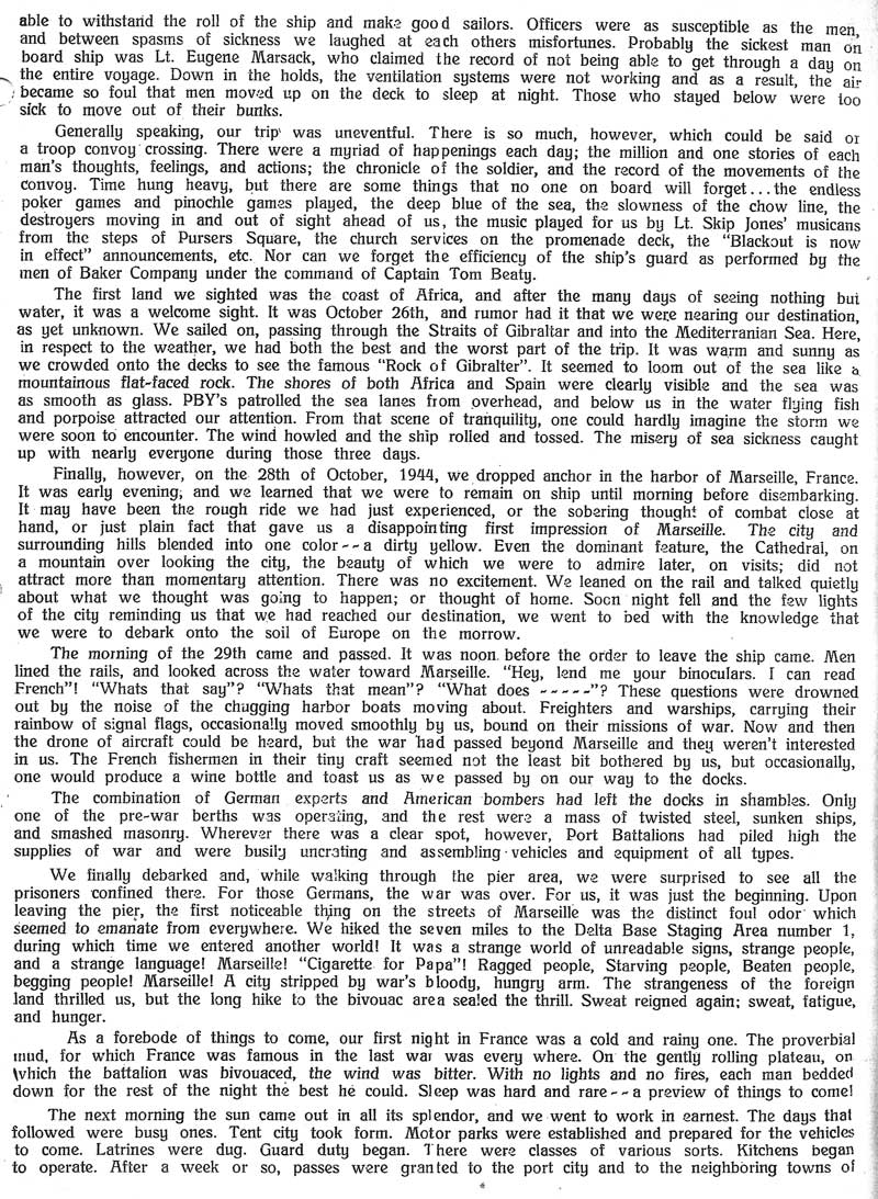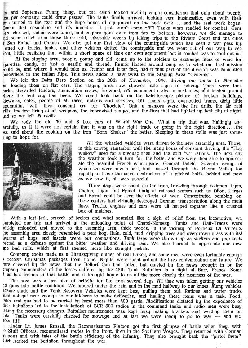 Vessell's Rangers - Marseilles, France Nov '44 Back Row: R. Scollins, F. Balcom, H. Lueth, E. Kase, Mr. Vessell and W. G...