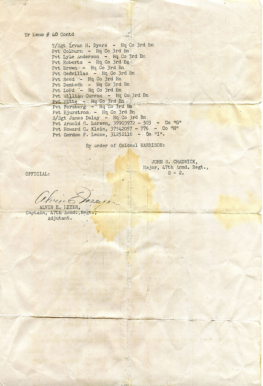 PVT Ward McAffee, S/SGT Robert Demuth, PFC Raymond Richards, T/5 William McCoy and Corporal Donald Traynor