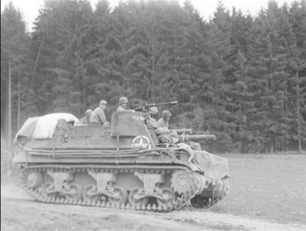 B Battery - T/4 Glenn H Thompson / Glenn’s M7 tank on prime mover on way to front – France – November 1944