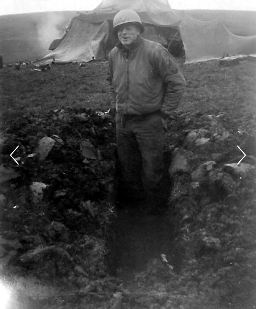 B Battery - T/4 Glenn H Thompson / Glenn standing in foxhole with about foot of water in it – first round fired in batt...