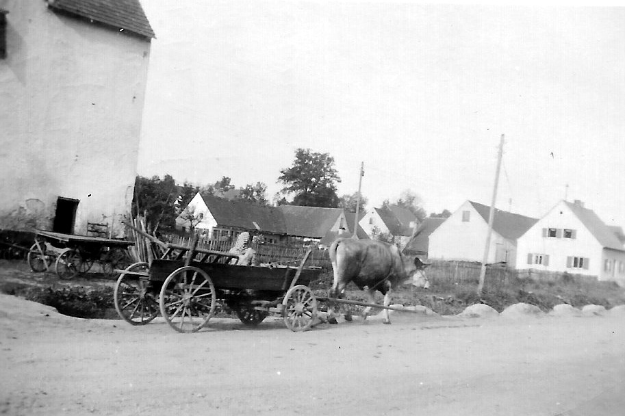 B Battery - T/4 Glenn H Thompson / Aiglesbach, Germany May 11, 1945 – Common sight one cow hitched to a wagon driven by ...